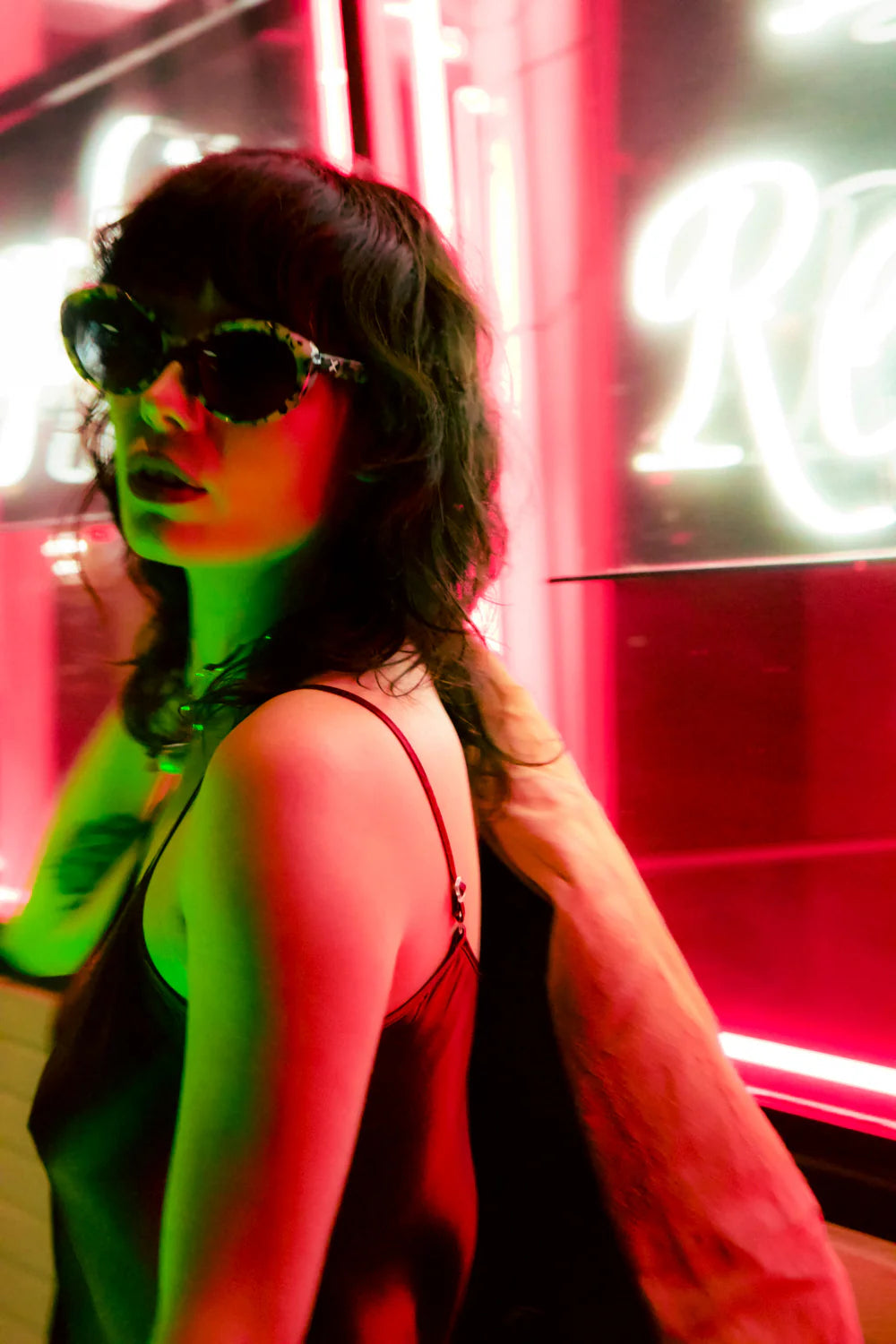 べっ甲のフレームとカラーレンズの組み合わせは、一際レトロな雰囲気を醸し出す。
